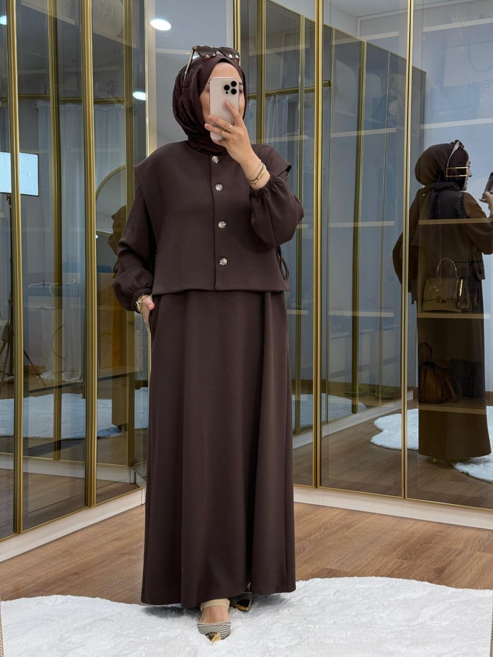 Asimetrik Düğme Detaylı Yelek Elbise Kahverengi