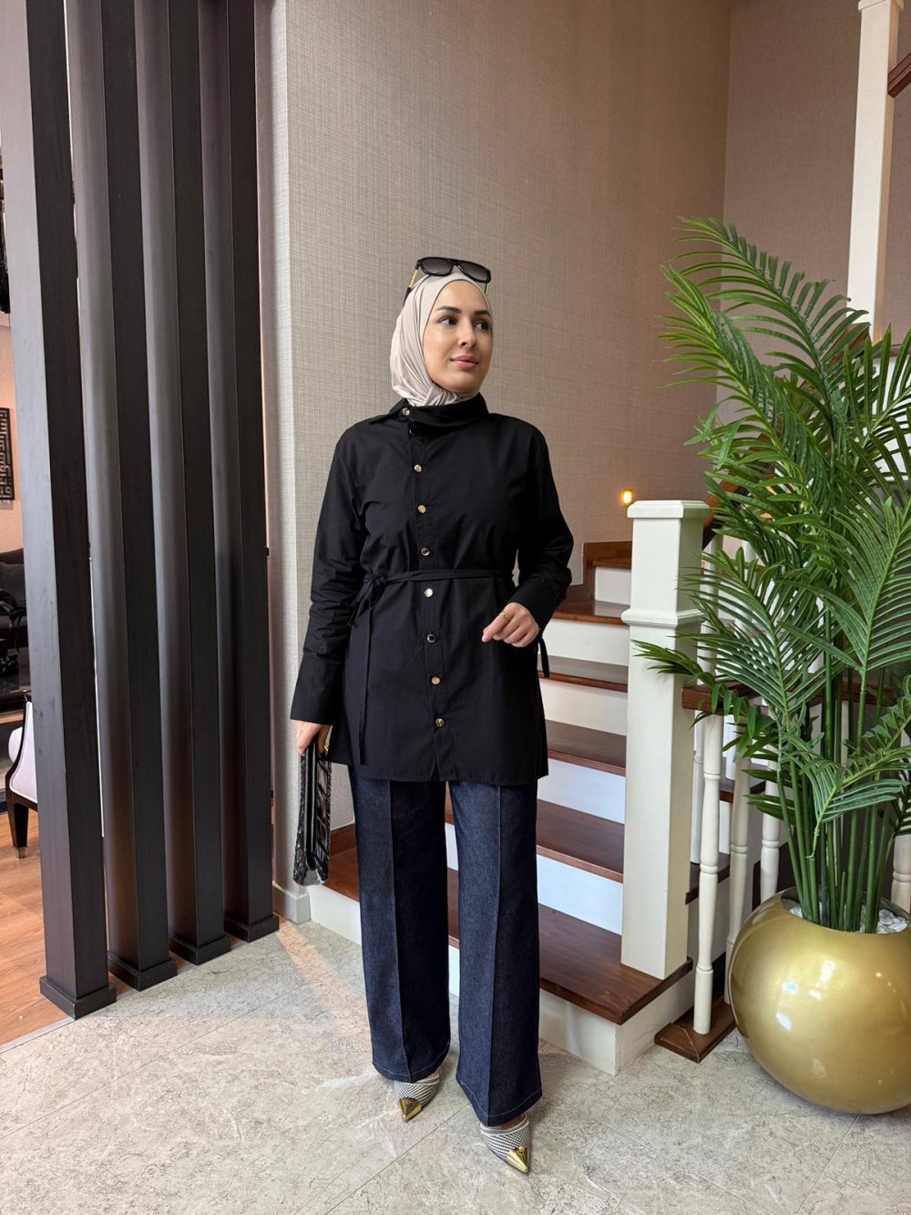 Asimetrik Yaka Gömlek Siyah