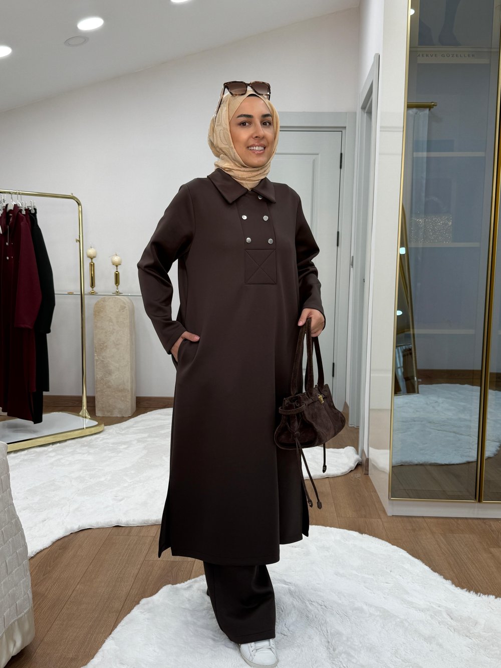 Çıtçıtlı Detaylı Maksi Boy Scuba Takım Kahverengi