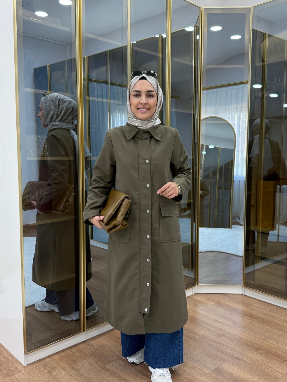 Çıtçıtlı Detaylı Parka Trençkot Haki