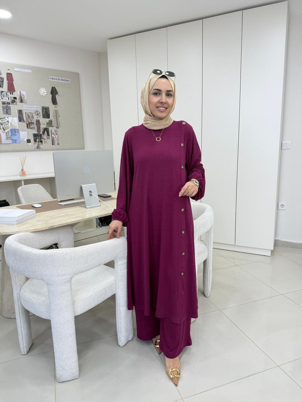 Tunik boy 120 cm’dir. Sol tarafında çubuk düğme detayı, bileklerinde lastik bulunmaktadır.