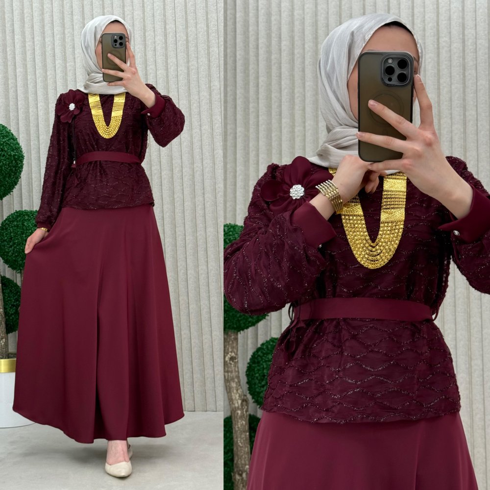 Üst kısmı simli jakar tül detayıyla ışıl ışıl, alt kısmı ise akışkan  pamuk saten  ile rahat ve zarif bir duruş sunar.