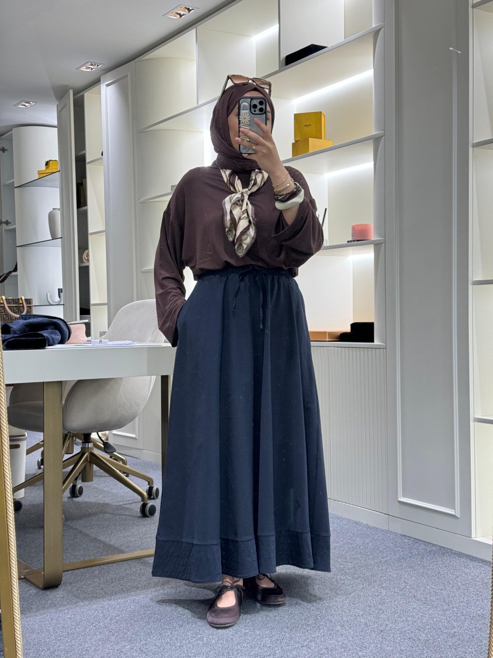 Dikiş Detaylı Beli Lastikli Etek Lacivert