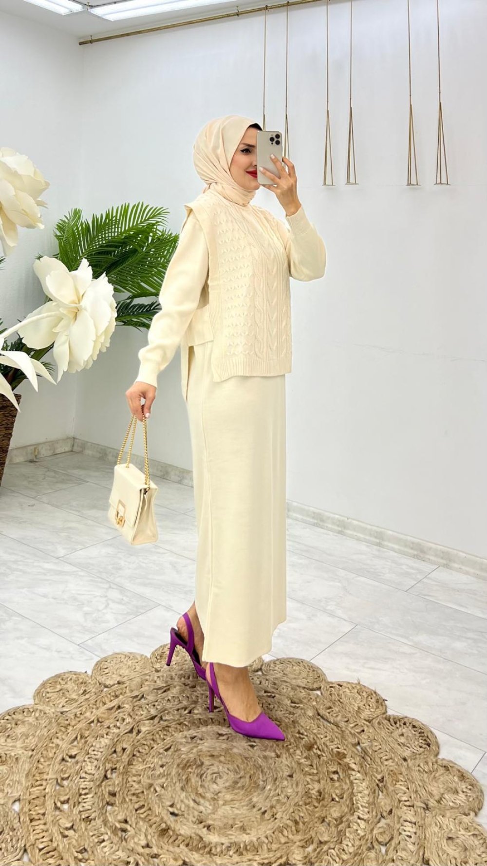 Ekru Damla Triko Elbise Takım Tesettür Giyim