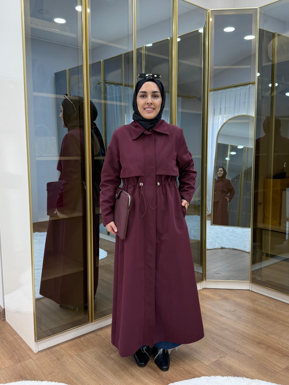 Fermuar Detaylı Maksi Boy Trençkot Bordo