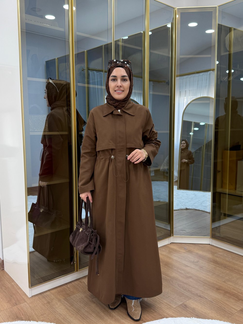 Fermuar Detaylı Maksi Boy Trençkot Kahverengi