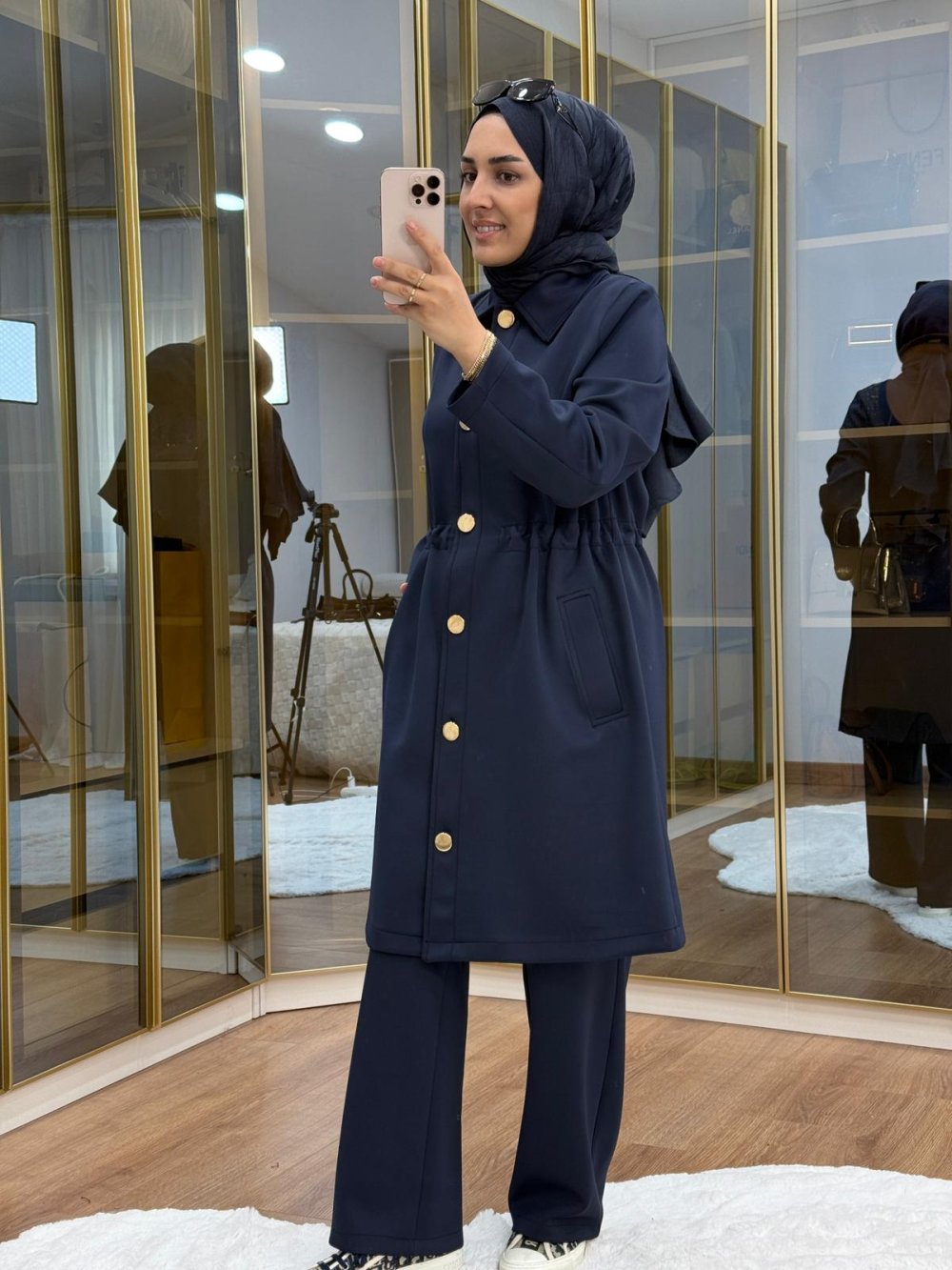 Gold Düğmeli Beli büzgülü Scuba Takım Lacivert