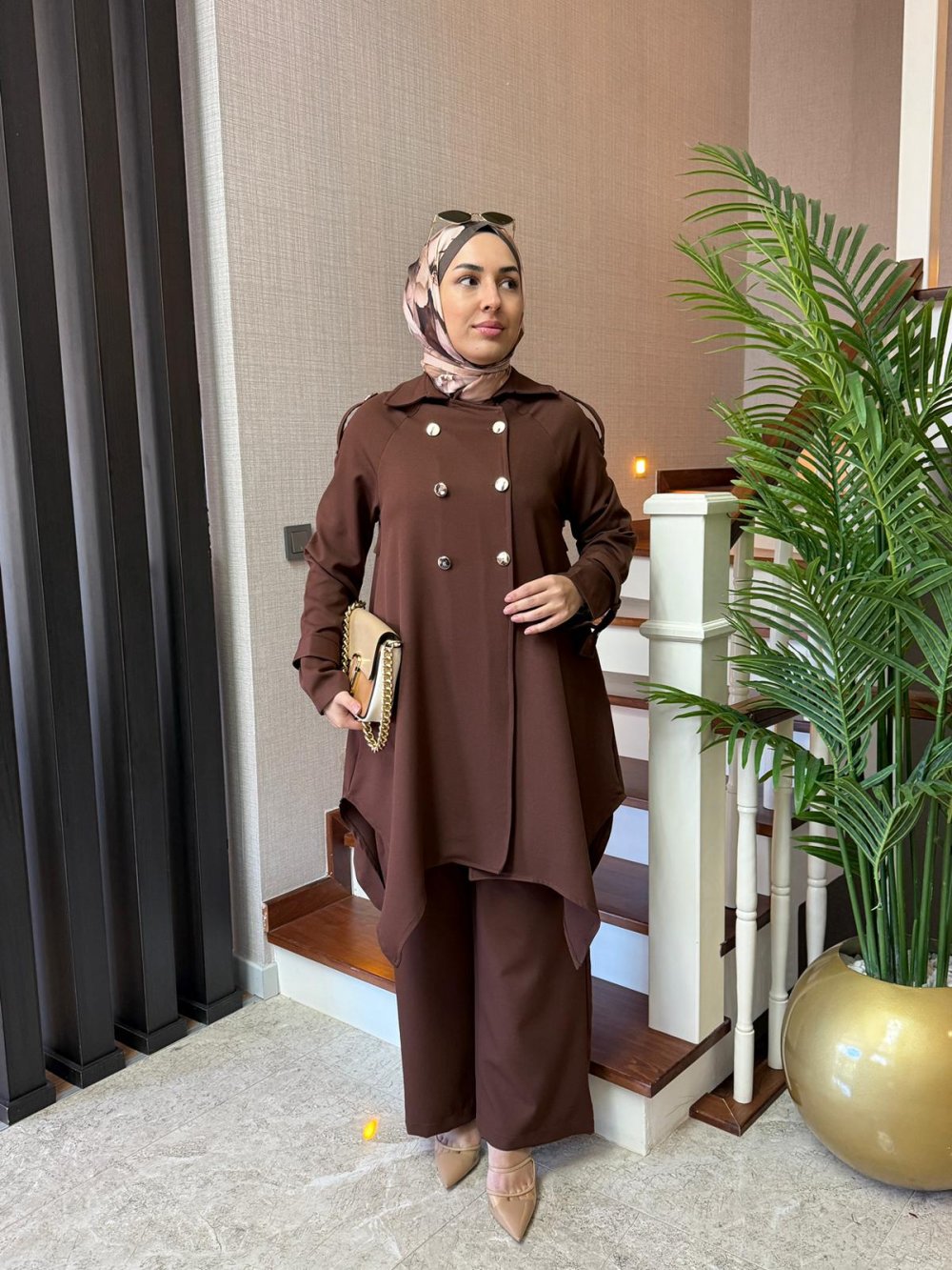 Gold Düğmeli Double Krep Takım Kahverengi
