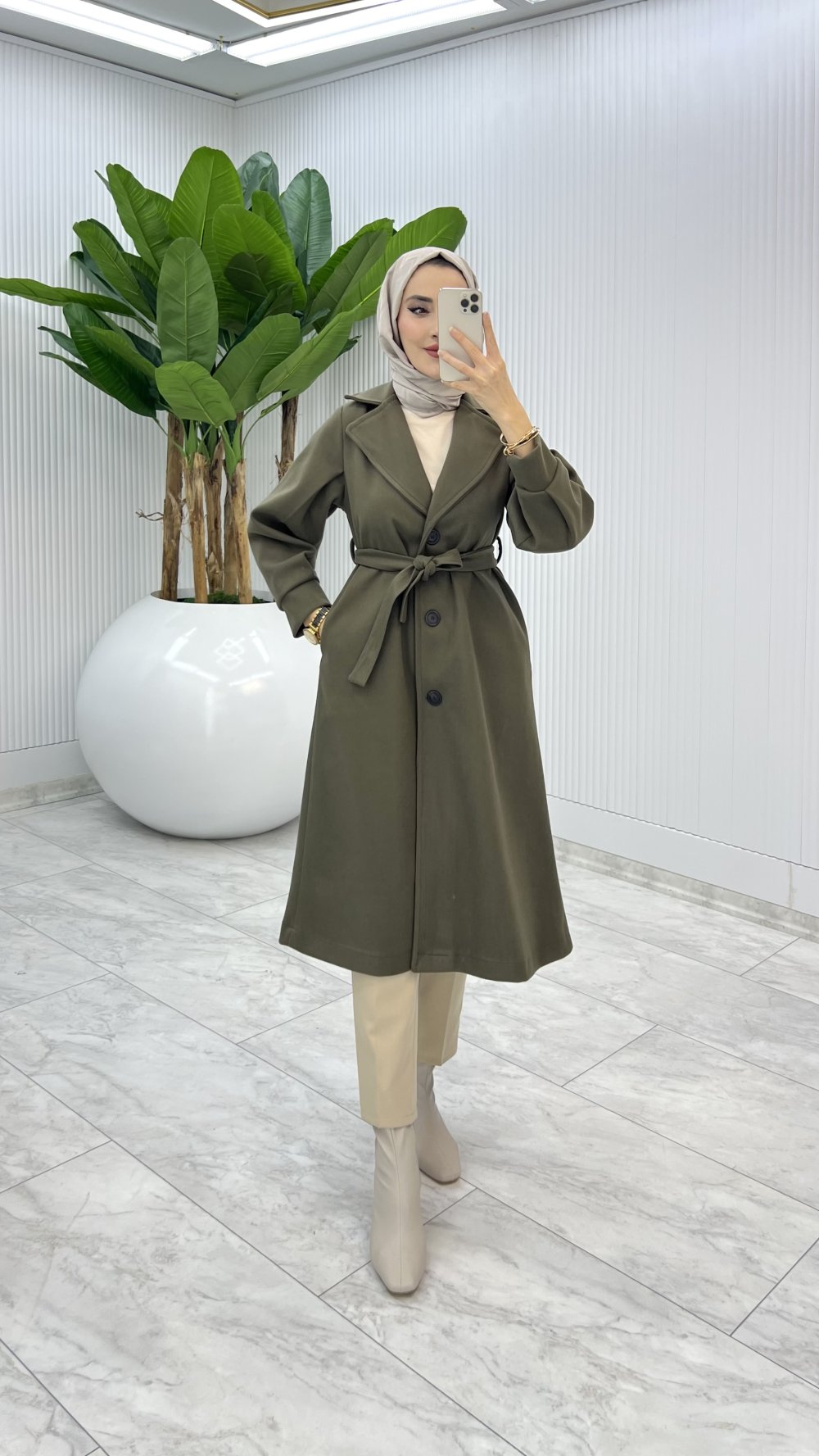 Haki Premıum Defne Kaşe Kaban Tesettür Giyim