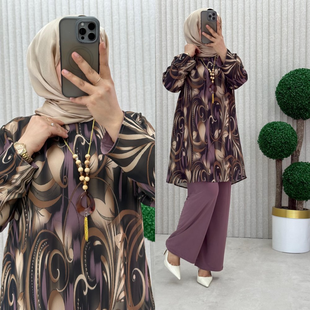 Tunik dijital baskılı şifon içi sandy kumaş