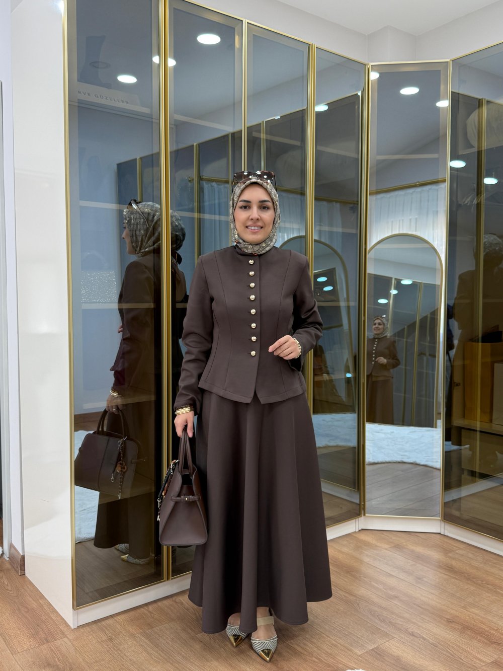 Kulp Detaylı Ceket Etekli Takım Kahverengi