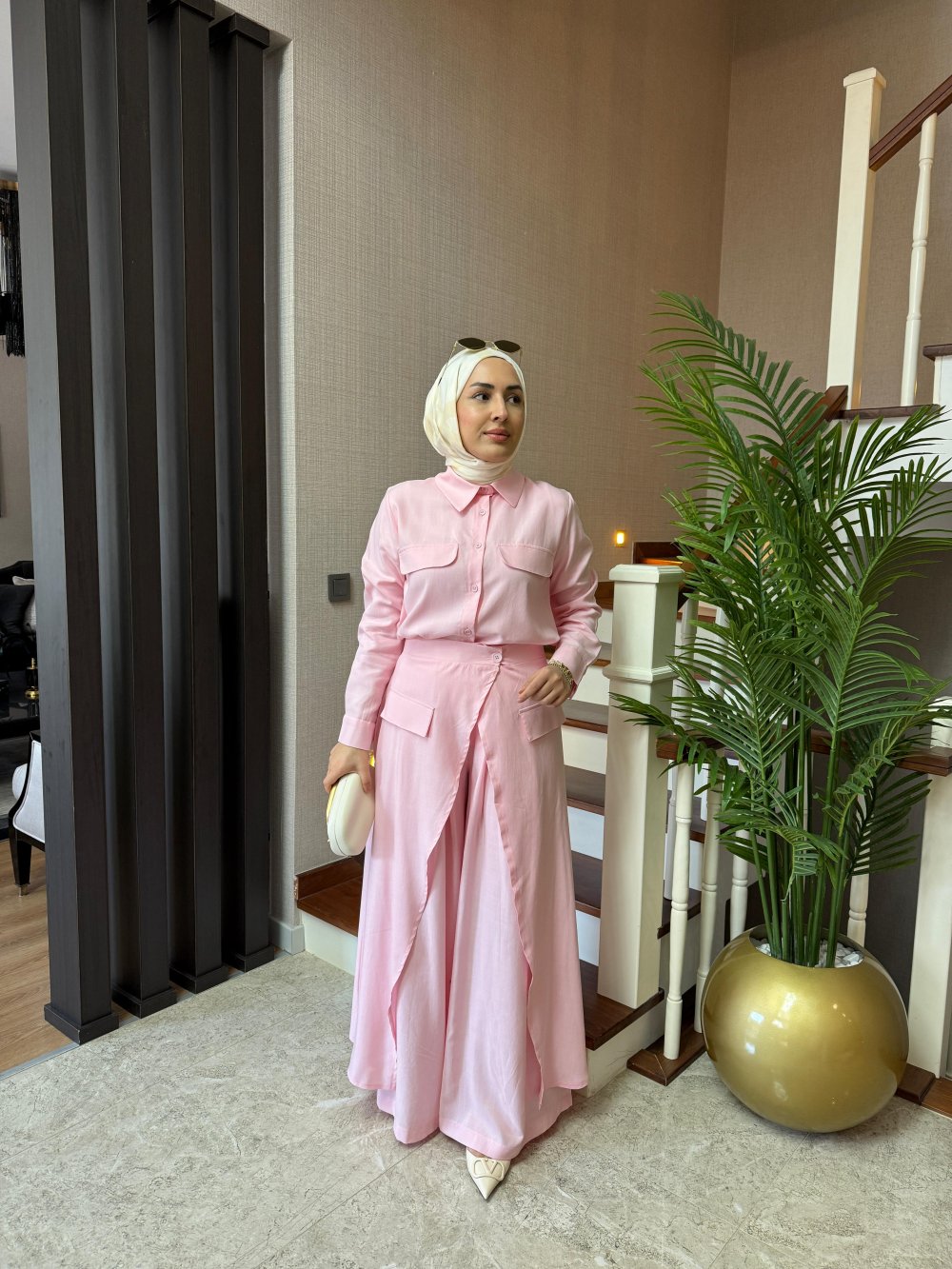 Pantolon etek formunda, boy 105 cm’dir ve beli arkadan lastiklidir.