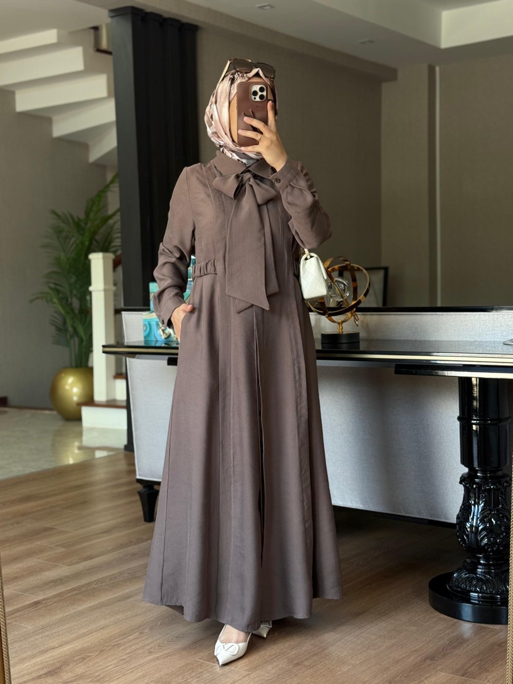 Elbise yakasında  seyyar kuşağı mevcuttur .(İster kuşak ile ister kuşaksız kullanım sağlayabilirsiniz)
