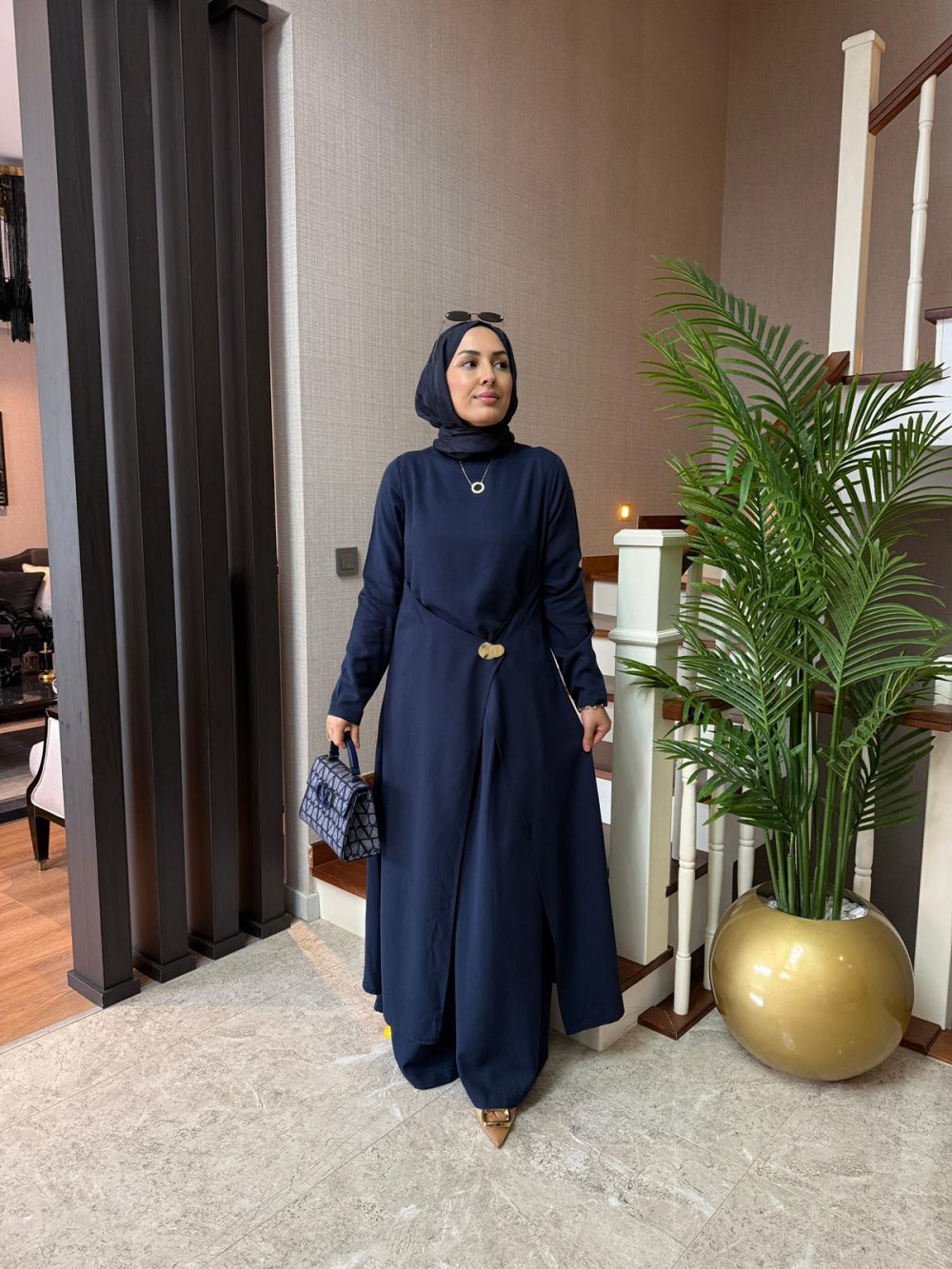 Pantolon boy 105 cm’dir. Önü kemerli, arkası lastiklidir. Pile detaylıdır. Palazzo pantolon formundadır.