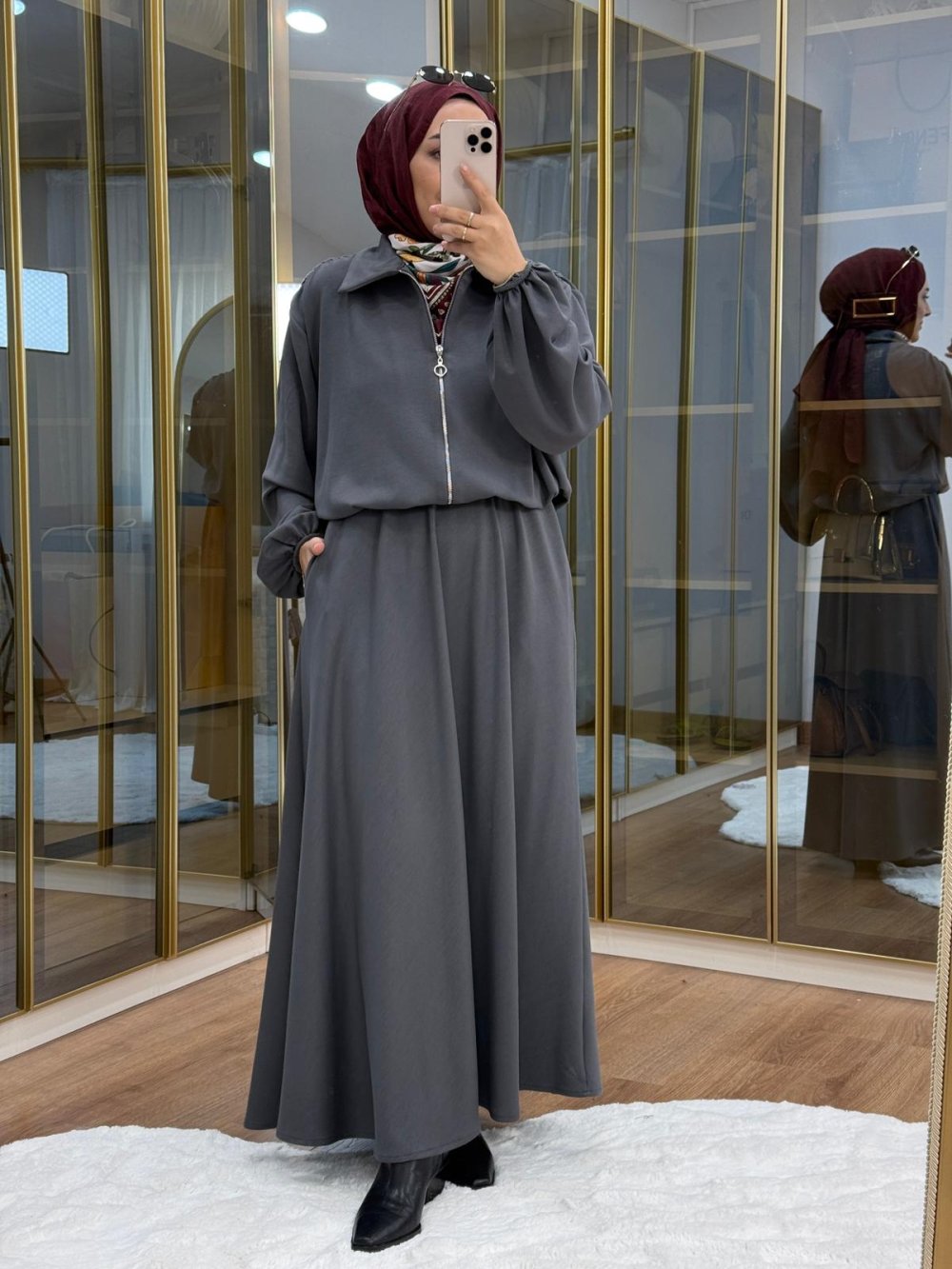 Omuzu Büzgülü Ceket Etek Takım Füme