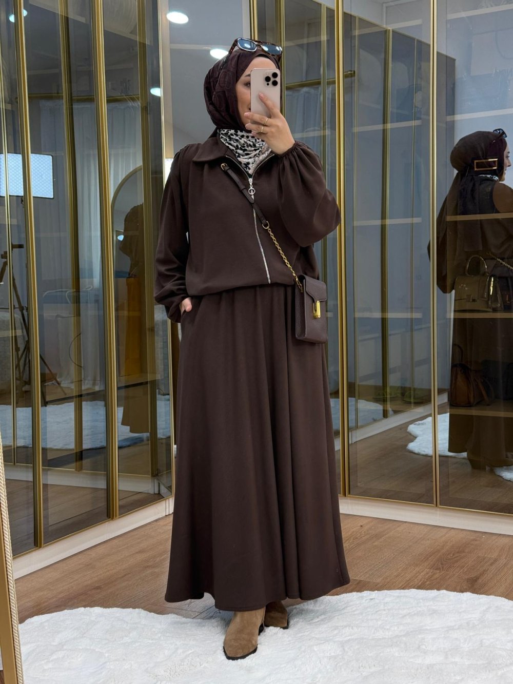 Omuzu Büzgülü Ceket Etek Takım Kahverengi