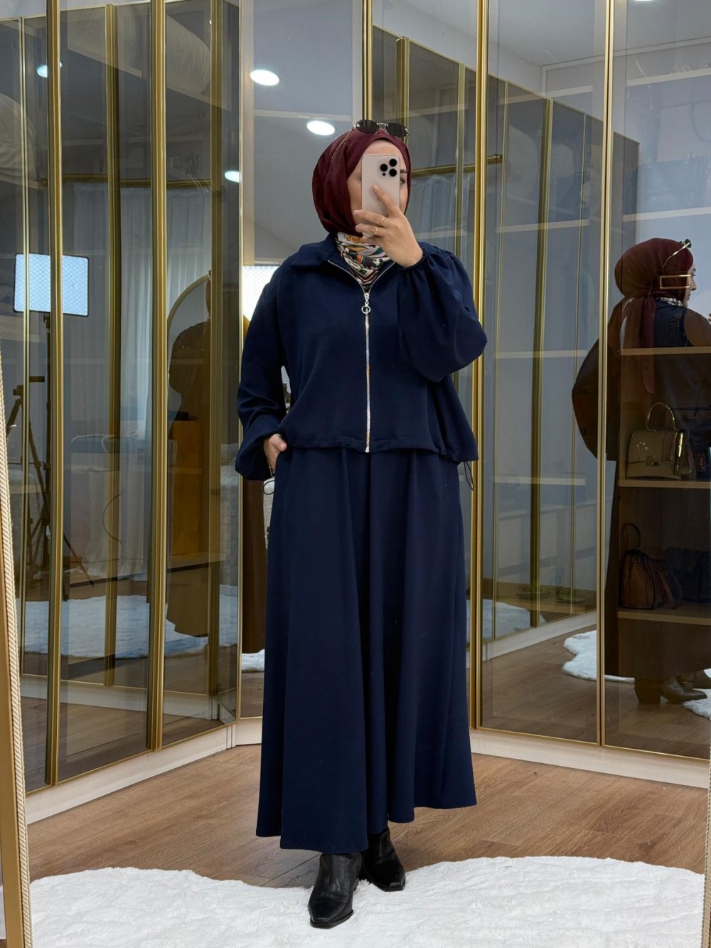 Omuzu Büzgülü Ceket Etek Takım Lacivert