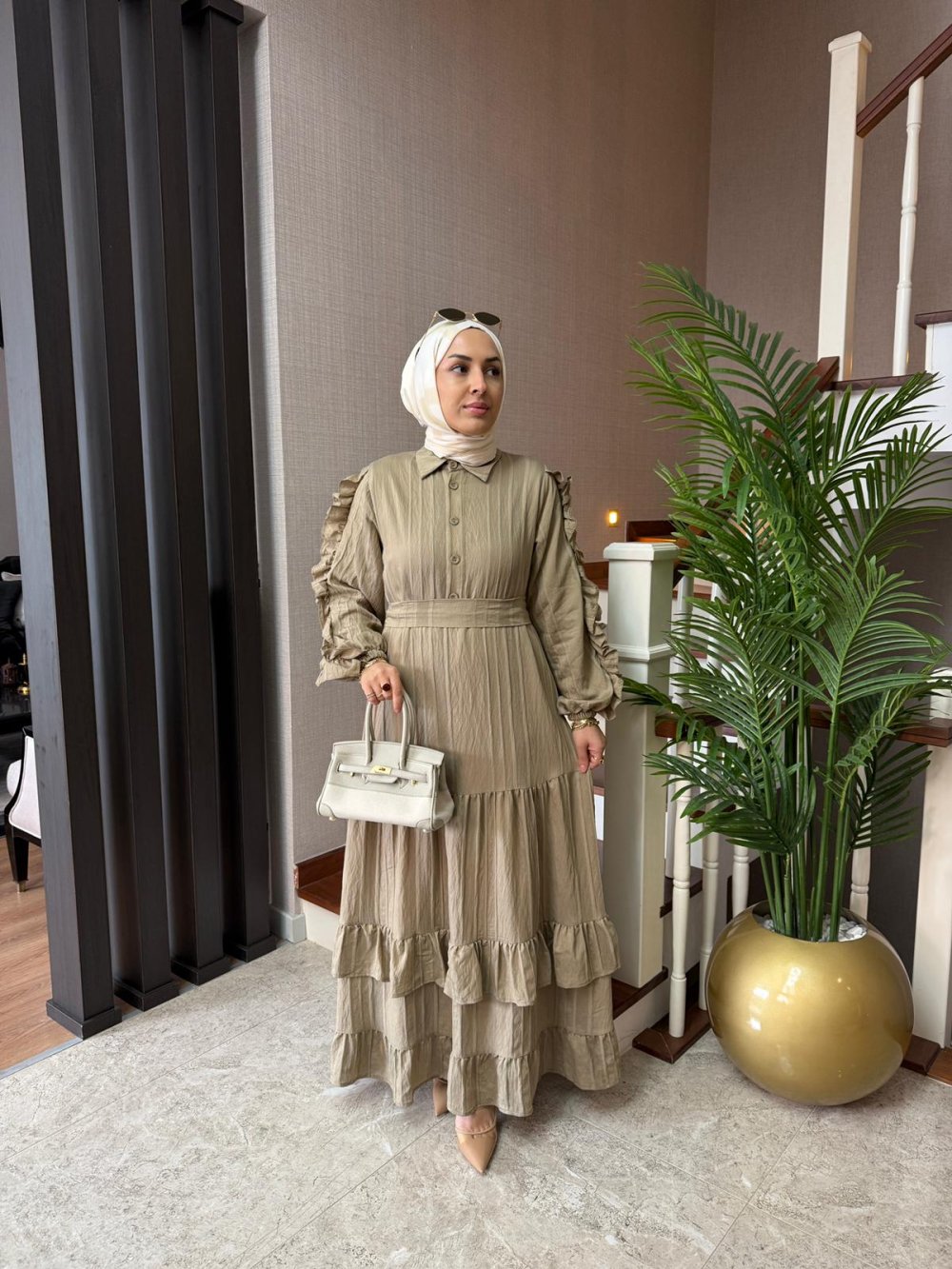 Seyyar kuşağı mevcuttur. Kollarında fırfır, etek uçlarında kat kat detayları bulunmaktadır. Kol uçları lastiklidir.