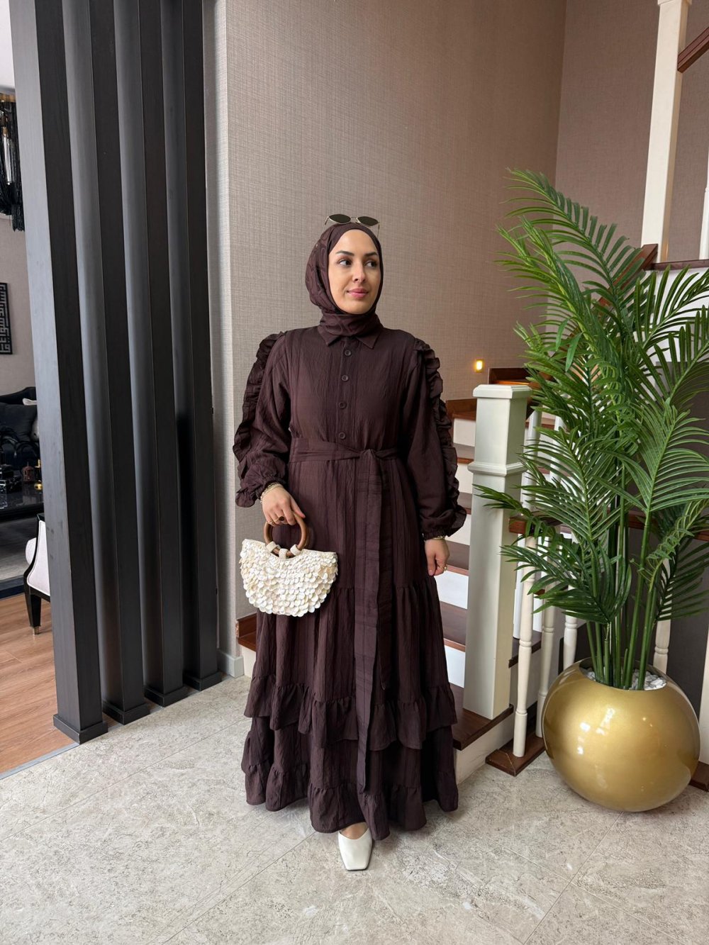 Seyyar kuşağı mevcuttur. Kollarında fırfır, etek uçlarında kat kat detayları bulunmaktadır. Kol uçları lastiklidir.