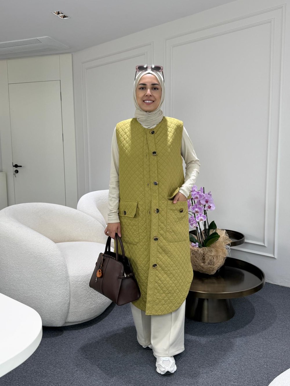 Uzun Kapitone Yelek Yağ Yeşili